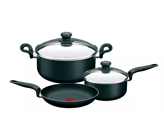 Set De Cocina Tefal Pratika 5 Piezas Tapas De Vidrio: Sartén 24 cm, Cacerola 20 cm + tapa vidrio, Olla 24 cm + tapa vidrio. Thermo-spot: Es un exclusivo indicador de temperatura que indica el momento preciso de iniciar la cocción de los alimentos. Tecnología exclusiva y patentada por la marca. Fondo difusor: Durabase (Optima distribución de calor). Exterior: Antiadherente PTFE. Interior: New Resist (4 capas: 3 antiadherentes y 1 relieve con textura para una mayor protección). Mangos y Tapas: Mangos de baquelita y tapas de vidrio. Grosor: 1.7mm. Color: Negro. Compatible con todas las cocinas excepto las de inducción.