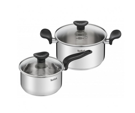 Set Cacerola de 16 cm y Olla de 20 cm Primary Tefal. Material: acero inoxidable. Compatibilidad con cocinas: Inducción, Gas, eléctrica, vitrocerámica, halógena. Apto para horno excepto las tapas. Acabado y revestimiento interior: acero inoxidable, efecto espejo. Tapas de vidrio con regulador de vapor. Thermospot con base difusora de calor. Marcas de medición. Apto para lavavajilla,.
