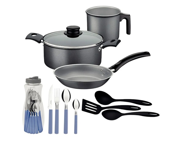 Set de aluminio con revestimiento antiadherente Starflon Max, libre de PFOA.. 1 sartén 24 cm 1,4 lts, 1 cacerola 24 cm 4,9 lts, 1 hervidor de 14 cm 1,7 lts. 1 tapa de vidrio templado, espátula, cuchara para servir, cucharón, 4 tenedores de mesa, 4 cuchillos para asado, 4 cucharas de mesa, 4 cucharas de té, Jarra de plástico. Mango y asas de baquelita antitérmica para seguridad en su manipulación. El juego es muy práctico y versátil, pudiendo introducirse en el lavavajillas y utilizarse en cocinas de gas, eléctricas y vitrocerámicas.