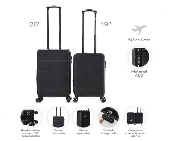Modelo: 18910. Set de 2 valijas rígidas, material ABS. Ruedas doble spinner 360º. Carro reforzado. Cierre expansible. Candado incorporado. Valija 19" (cm): 43x30x19. Valija 20" (cm): 49x33x21.