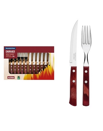 Modelo: 21199-703. Un juego completo de la línea Churrasco que ofrece cuchillos y tenedores con láminas de acero inoxidable y mangos de madera tratada Polywood resistentes a impactos y altas temperaturas, llevando belleza a la mesa, además de alta calidad y durabilidad. La elección ideal para los que desean que todos puedan tener una excelente experiencia en el momento de apreciar un buen asado. El Juego Contenido: 6 Cuchillo Asado 5" Polywood y 6 Tenedor Mesa Polywood